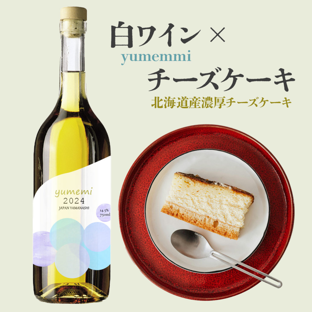 ②「北海道産濃厚チーズケーキ」と白ワイン「yumemi」