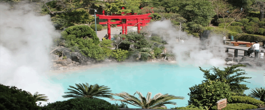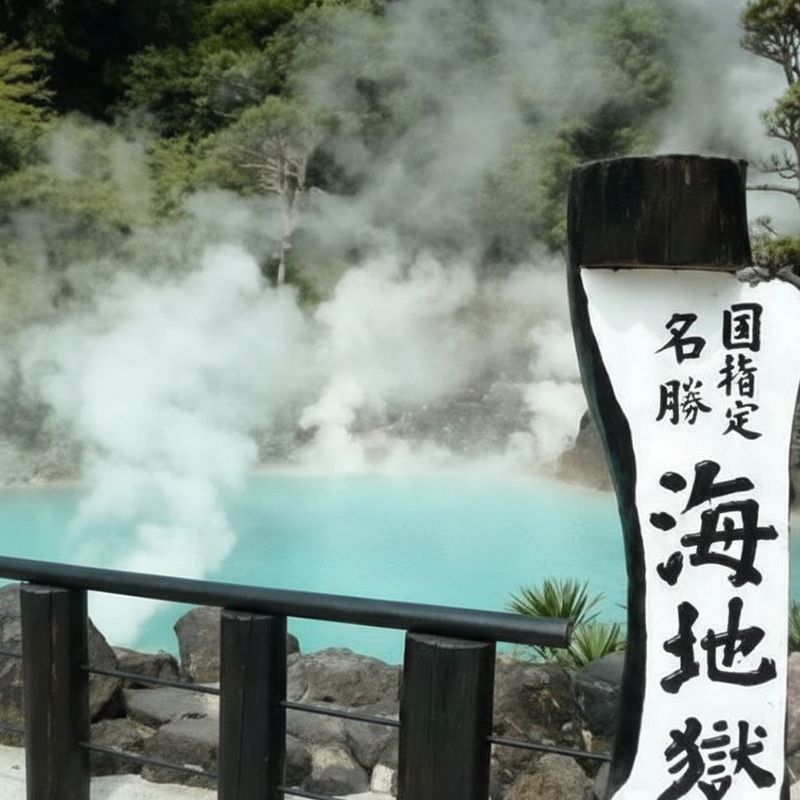 別府地獄めぐりの一つで、コバルトブルーの池が美しい国指定の名勝。約1200年前に鶴見岳の爆発によってできたとされ、池の温度は約98度にもなります。涼しげな見た目とは裏腹に、湯けむりが絶えず立ち上る光景は、まさに”地獄”の名にふさわしい迫力です。